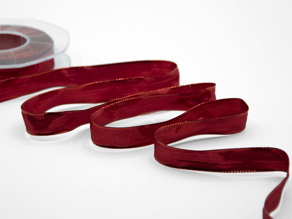 Piattina Elegante C Rame 15 MM Rosso. Nastro in taffetà cangiante con filato lurex oro e argento, per confezioni regalo di grande qualità. Codice colore# 31 - CONFEZIONATO IN BOBINA DA METRI 20