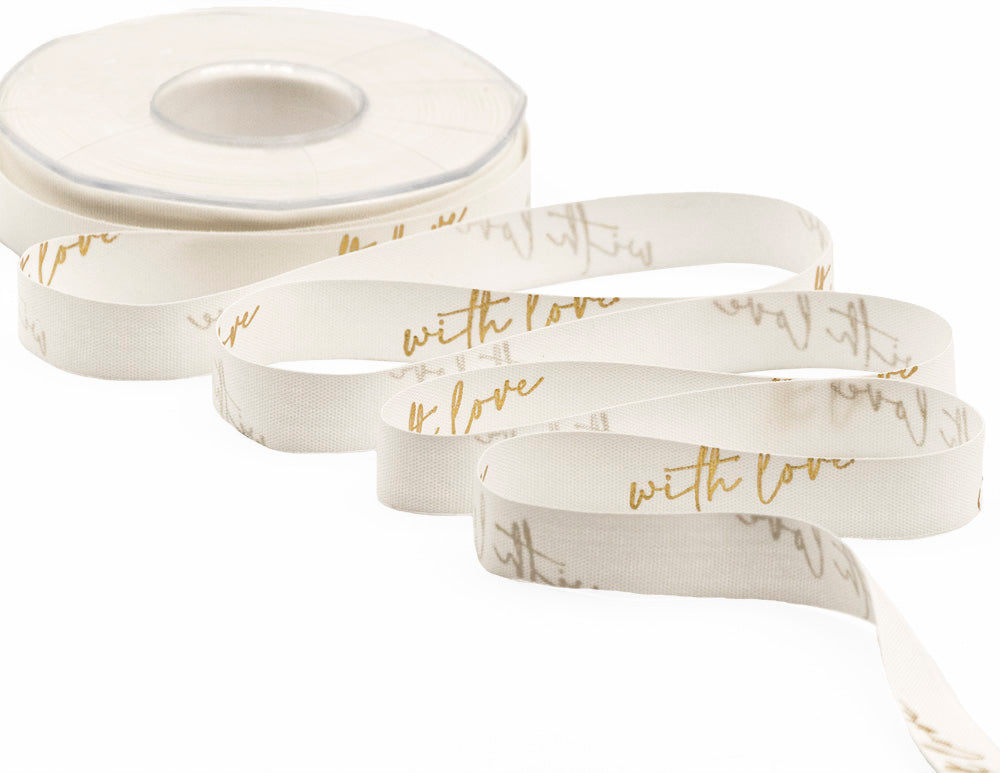 Policotone 15 mm With Love Oro. I nastri in policotone e dall’aspetto naturale sono in linea con le tendenze green per realizzare confezioni e decorazioni dall’effetto rustico o grezzo. Molto apprezzato per le sue caratteristiche sono i nastri in poliestere cotoniero. Opaco, dall’aspetto naturale, è piacevole al tatto perché è morbido e caldo, sembra leggermente felpato. Si lavora facilmente e viene usato sempre più spesso per le creazioni di confezioni di regalo di lusso, per le maniglie di shopper, per le creazioni di bomboniere, per le decorazioni natalizie, per gli addobbi floreali e per le confezioni alimentari. Apprezzato anche da importanti marchi di moda è stato scelto per la personalizzazione del loro nastro con logo. Come tutti i nostri nastri si annoda molto facilmente e al taglio non si sfilaccia. Il nastro in tessuto tipo cotone viene prodotta in un’ampia gamma di colori ed altezze ed è qui presentata nella variante stampata. Codice colore # 23/102. Confezionato in bobina da 10 metri.