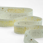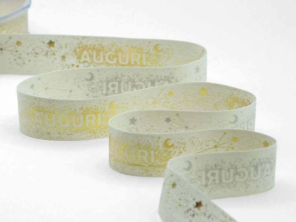 Policotone 25 mm Serigrafia Laminata Costellazione Auguri Avorio. Questa magnifica variante del nostro nastro in policotone è caratterizzata dalla tramatura con filato lamè che da un lato dona un aspetto glitter al nastro, dall'altro un aspetto più elegante e raffinato con la presenza del lamè delicata e tenue. Il nastro in policotone si lavora facilmente e viene usato sempre più spesso per le creazioni di confezioni di regalo di lusso, per le maniglie di shopper, per le creazioni di bomboniere, per le decorazioni natalizie, per gli addobbi floreali e per le confezioni alimentari. Qui è presentato nella variante stampata in serigrafia e laminata. Codice colore #22W35 - CONFEZIONATO IN BOBINA DA METRI 10