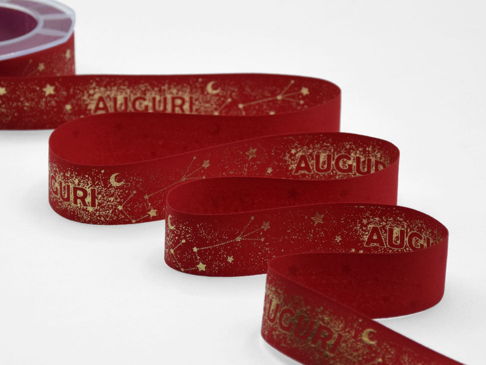 Policotone 25 mm Serigrafia Laminata Costellazione Auguri Rosso. Questa magnifica variante del nostro nastro in policotone è caratterizzata dalla tramatura con filato lamè che da un lato dona un aspetto glitter al nastro, dall'altro un aspetto più elegante e raffinato con la presenza del lamè delicata e tenue. Il nastro in policotone si lavora facilmente e viene usato sempre più spesso per le creazioni di confezioni di regalo di lusso, per le maniglie di shopper, per le creazioni di bomboniere, per le decorazioni natalizie, per gli addobbi floreali e per le confezioni alimentari. Qui è presentato nella variante stampata in serigrafia e laminata. Codice colore #22W31 - CONFEZIONATO IN BOBINA DA METRI 10