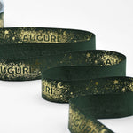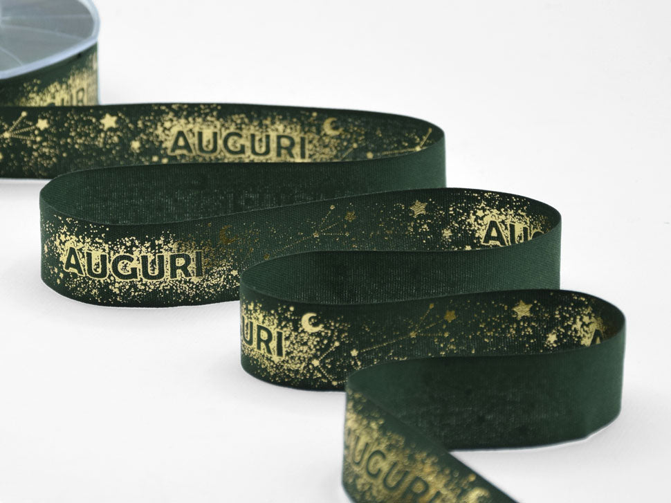 Policotone 25 mm Serigrafia Laminata Costellazione Auguri Verde Inglese. Questa magnifica variante del nostro nastro in policotone è caratterizzata dalla tramatura con filato lamè che da un lato dona un aspetto glitter al nastro, dall'altro un aspetto più elegante e raffinato con la presenza del lamè delicata e tenue. Il nastro in policotone si lavora facilmente e viene usato sempre più spesso per le creazioni di confezioni di regalo di lusso, per le maniglie di shopper, per le creazioni di bomboniere, per le decorazioni natalizie, per gli addobbi floreali e per le confezioni alimentari. Qui è presentato nella variante stampata in serigrafia e laminata. Codice colore #22W633 - CONFEZIONATO IN BOBINA DA METRI 10