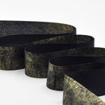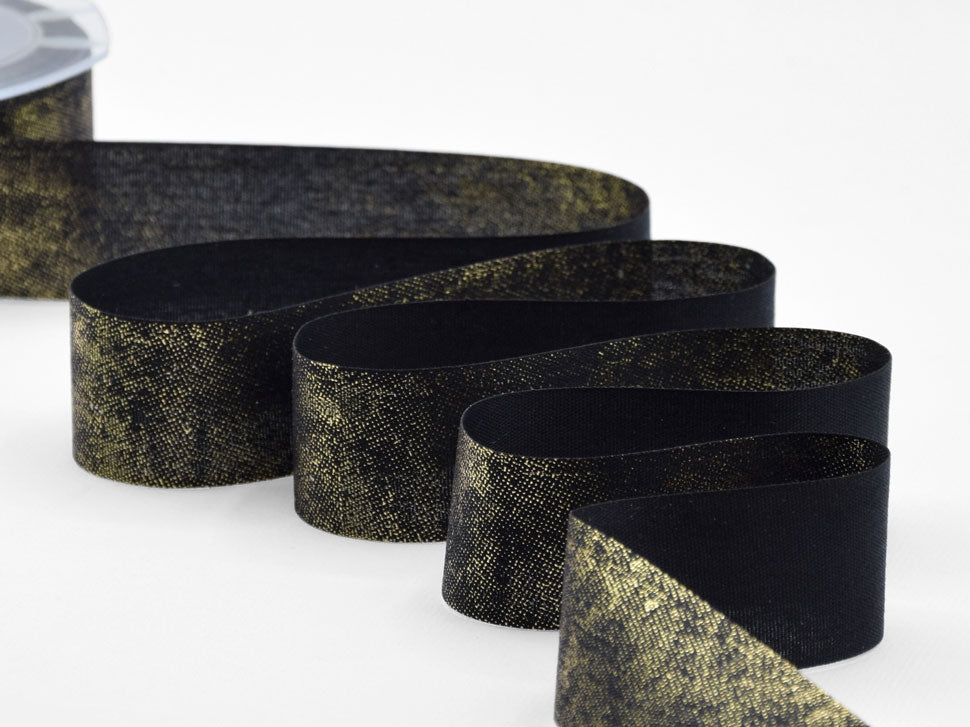 Poly Cotone 35 mm Serigrafia Laminata Murales Nero. Un nastro modernissimo, dall'aspetto urban e contemporaneo, illumina e abbellisce ogni decorazione, con la sua laminazione d'oro e lo sfondo colorato, si abbina facilmente alle vostre confezioni donando un tocco di prestigio e unicità. Codice colore# 33 - CONFEZIONATO IN BOBINA DA METRI 10