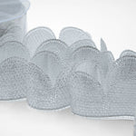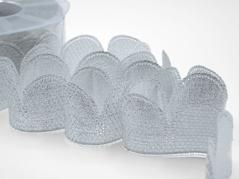 Portaconfetti Antares 50 MM Argento. Il nastro porta confetti permette di confezionare una bomboniera in modo semplice divertente. Si presenta come nastro doppio, da un lato coprente e dall’altro trasparente, tagliato e bordato con disegni a forma di petali ripetuti a sequenza. Elegante, raffinato, morbido al tatto è adatto alla realizzazione di bomboniere fai da te per ogni tipo di occasione e di cerimonia: battesimo, comunione, cresima, laurea, matrimonio, diciottesimo, fidanzamento. Ideale anche come segnaposto. Facilissimo da lavorare, per confezionare la nostra coccarda basta srotolare il nastro, inserire in ogni petalo un confetto, tagliare il nastro dopo 5 tasche, afferrare i tiranti laterali di entrambi i nastri e tirare, ottenendo così con un semplice gesto dei bellissimi fiori con 5 petali e cinque confetti. Per fare 5 petali, ovvero una bomboniera, servono 26 cm di nastro porta-confetti.. Codice colore# 101 - CONFEZIONATO IN BOBINA DA METRI 25