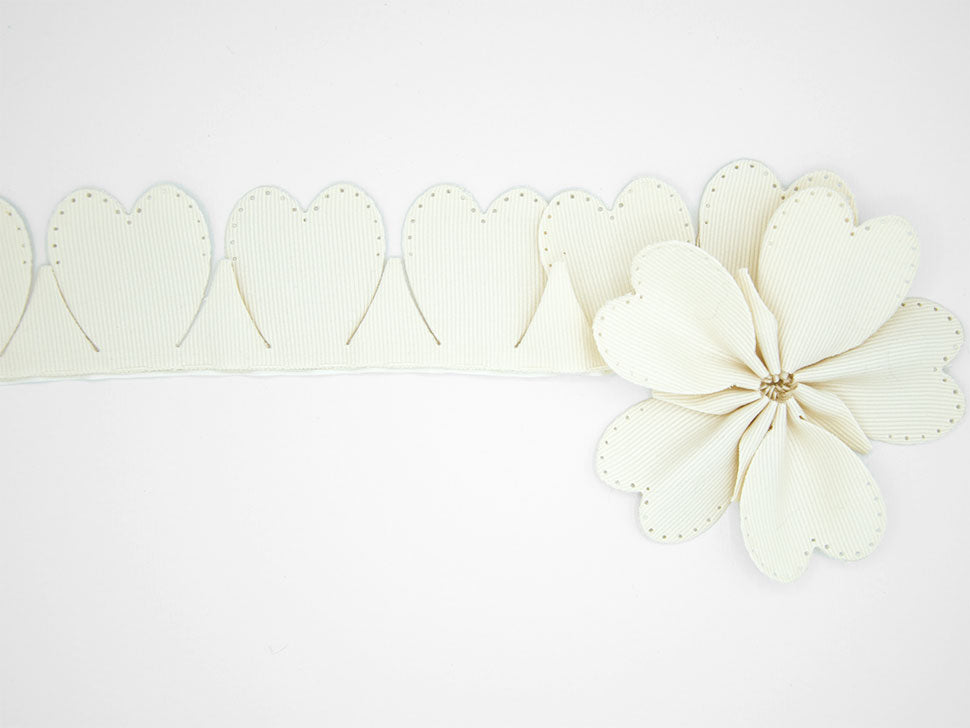 Portaconfetti Cuore Gros Grain Avorio. Il nastro portaconfetti permette di confezionare bomboniere o segnaposti in modo semplice e divertente. Venduto a rotolo da 10 metri, abbiamo calcolato che con una bobina di nastro e l'utilizzo di 5 petali per bomboniera, ovvero 26 cm di nastro portaconfetti, si possono realizzare circa 37 coccarde bomboniere. Facilissimo da lavorare, per confezionare la nostra coccarda basta srotolare il nastro, inserire in ogni petalo un confetto, tagliare il nastro dopo 5 tasche, afferrare i tiranti da entrambi i lati (due per ogni lato) tirare, ottenendo così in un semplice gesto dei bellissimi fiori margherita, con 5 petali e cinque confetti.