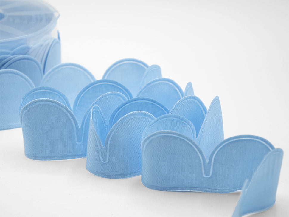 Portaconfetto Petali Cotone Azzurro Baby. Il nastro porta confetti permette di confezionare una bomboniera in modo semplice divertente. Si presenta come nastro doppio, da un lato coprente e dall’altro trasparente, tagliato e bordato con disegni a forma di petali ripetuti a sequenza. Elegante, raffinato, morbido al tatto è adatto alla realizzazione di bomboniere fai da te per ogni tipo di occasione e di cerimonia: battesimo, comunione, cresima, laurea, matrimonio, diciottesimo, fidanzamento. Ideale anche come segnaposto. Facilissimo da lavorare, per confezionare la nostra coccarda basta srotolare il nastro, inserire in ogni petalo un confetto, tagliare il nastro dopo 5 tasche, afferrare i tiranti laterali di entrambi i nastri e tirare, ottenendo così con un semplice gesto dei bellissimi fiori con 5 petali e cinque confetti. Per fare 5 petali, ovvero una bomboniera, servono 26 cm di nastro porta-confetti.. Codice colore# 593 - CONFEZIONATO IN BOBINA DA METRI 25