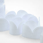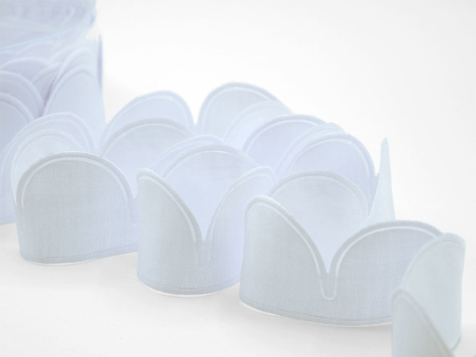 Portaconfetto Petali Cotone Bianco Ottico. Il nastro porta confetti permette di confezionare una bomboniera in modo semplice divertente. Si presenta come nastro doppio, da un lato coprente e dall’altro trasparente, tagliato e bordato con disegni a forma di petali ripetuti a sequenza. Elegante, raffinato, morbido al tatto è adatto alla realizzazione di bomboniere fai da te per ogni tipo di occasione e di cerimonia: battesimo, comunione, cresima, laurea, matrimonio, diciottesimo, fidanzamento. Ideale anche come segnaposto. Facilissimo da lavorare, per confezionare la nostra coccarda basta srotolare il nastro, inserire in ogni petalo un confetto, tagliare il nastro dopo 5 tasche, afferrare i tiranti laterali di entrambi i nastri e tirare, ottenendo così con un semplice gesto dei bellissimi fiori con 5 petali e cinque confetti. Per fare 5 petali, ovvero una bomboniera, servono 26 cm di nastro porta-confetti.. Codice colore# 13 - CONFEZIONATO IN BOBINA DA METRI 25