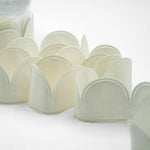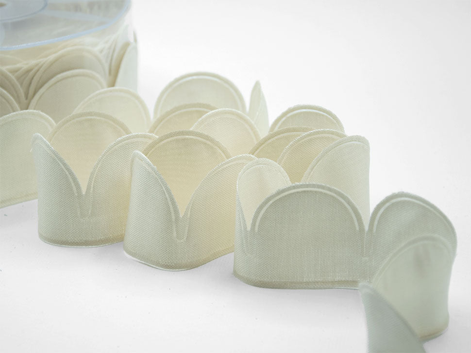 Portaconfetto Petali Cotone Latte. Il nastro porta confetti permette di confezionare una bomboniera in modo semplice divertente. Si presenta come nastro doppio, da un lato coprente e dall’altro trasparente, tagliato e bordato con disegni a forma di petali ripetuti a sequenza. Elegante, raffinato, morbido al tatto è adatto alla realizzazione di bomboniere fai da te per ogni tipo di occasione e di cerimonia: battesimo, comunione, cresima, laurea, matrimonio, diciottesimo, fidanzamento. Ideale anche come segnaposto. Facilissimo da lavorare, per confezionare la nostra coccarda basta srotolare il nastro, inserire in ogni petalo un confetto, tagliare il nastro dopo 5 tasche, afferrare i tiranti laterali di entrambi i nastri e tirare, ottenendo così con un semplice gesto dei bellissimi fiori con 5 petali e cinque confetti. Per fare 5 petali, ovvero una bomboniera, servono 26 cm di nastro porta-confetti.. Codice colore# 30 - CONFEZIONATO IN BOBINA DA METRI 25