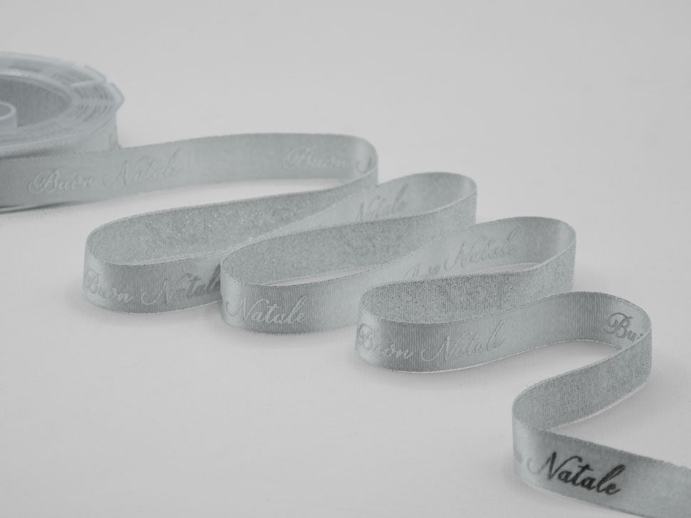 Raso Boutique Lame 16 MM Ser. Laminata Decoro Elegante Buon Natale Argento. Questa magnifica variante del nostro doppio raso è caratterizzata dalla tramatura con filato lamè che da un lato dona un aspetto glitter al nastro, dall'altro un aspetto più elegante e raffinato con la presenza del lamè delicata e tenue. Il Raso lamé è adatto a tutte le confezioni per il Natale, alle nozze, alle celebrazioni eleganti e glamour. Qui viene presentata la versione stampata in serigrafia laminata. Codice colore# 20W101 - CONFEZIONATO IN BOBINA DA METRI 10