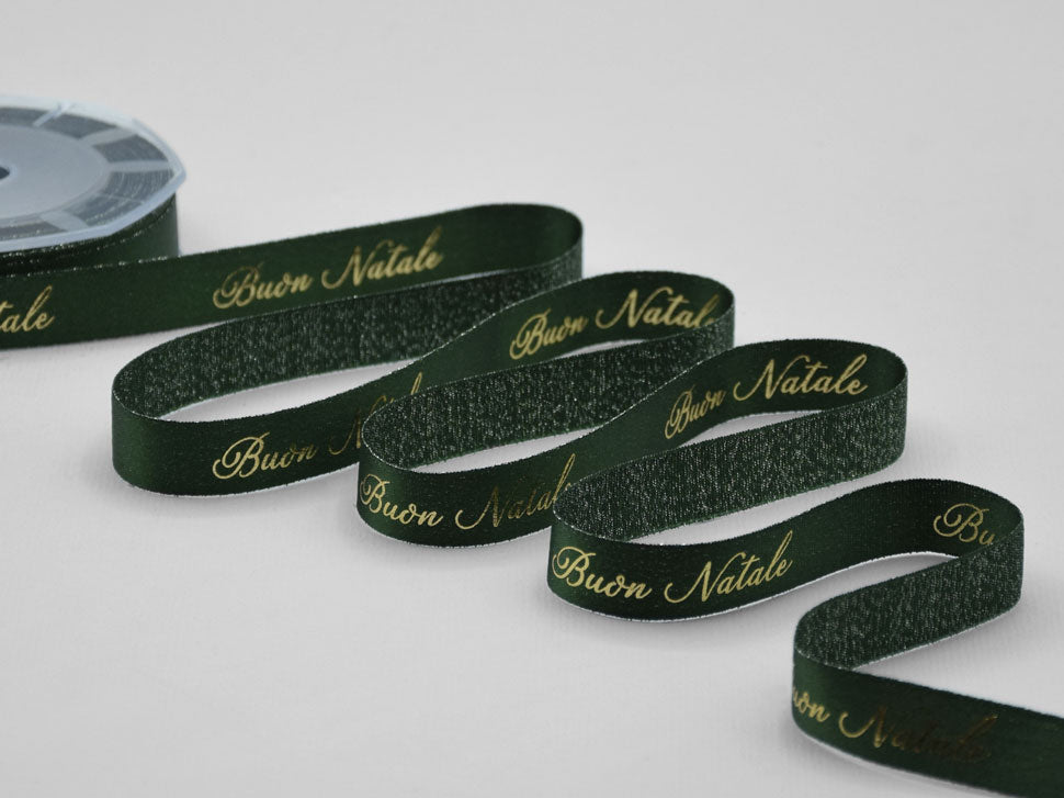 Raso Boutique Lame 16 MM Ser. Laminata Decoro Elegante Buon Natale Verde Inglese. Questa magnifica variante del nostro doppio raso è caratterizzata dalla tramatura con filato lamè che da un lato dona un aspetto glitter al nastro, dall'altro un aspetto più elegante e raffinato con la presenza del lamè delicata e tenue. Il Raso lamé è adatto a tutte le confezioni per il Natale, alle nozze, alle celebrazioni eleganti e glamour. Qui viene presentata la versione stampata in serigrafia laminata. Codice colore# 20W633 - CONFEZIONATO IN BOBINA DA METRI 10