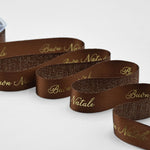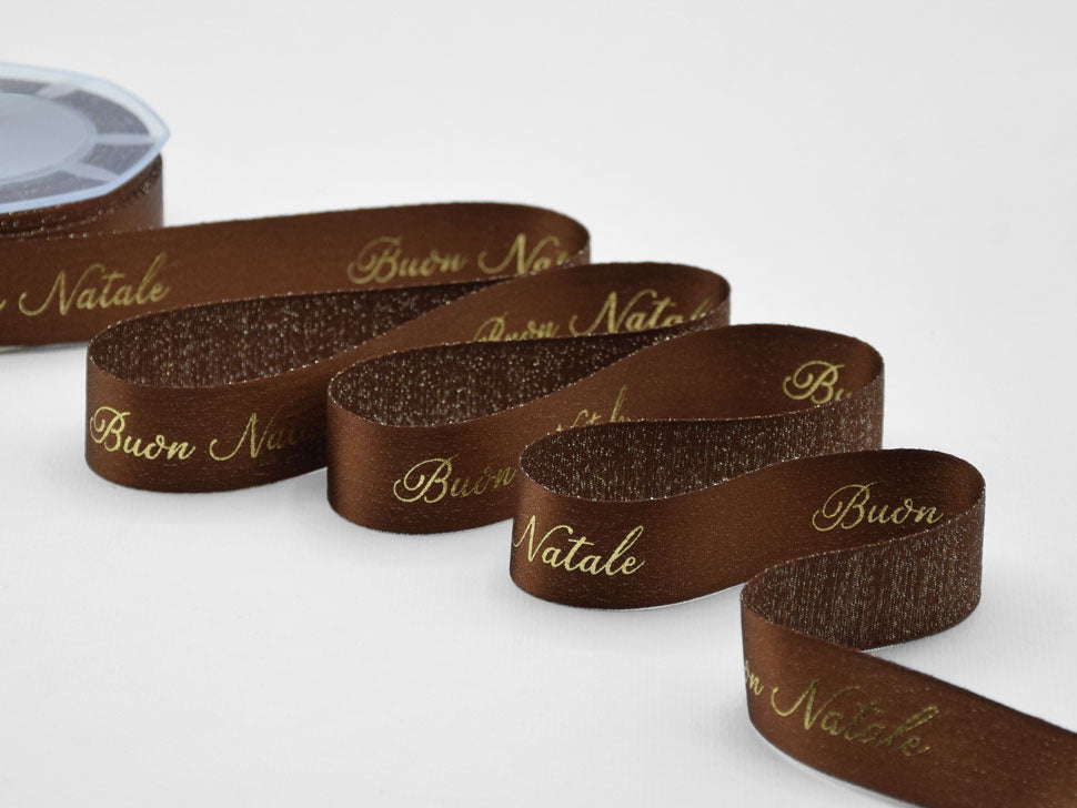 Raso Boutique Lame 25 MM Ser. Laminata Buon Natale Marrone. Questa magnifica variante del nostro doppio raso è caratterizzata dalla tramatura con filato lamè che da un lato dona un aspetto glitter al nastro, dall'altro un aspetto più elegante e raffinato con la presenza del lamè delicata e tenue. Il Raso lamé è adatto a tutte le confezioni per il Natale, alle nozze, alle celebrazioni eleganti e glamour. Qui viene presentata la versione stampata in serigrafia laminata. Codice colore# 20W44 - CONFEZIONATO IN BOBINA DA METRI 10