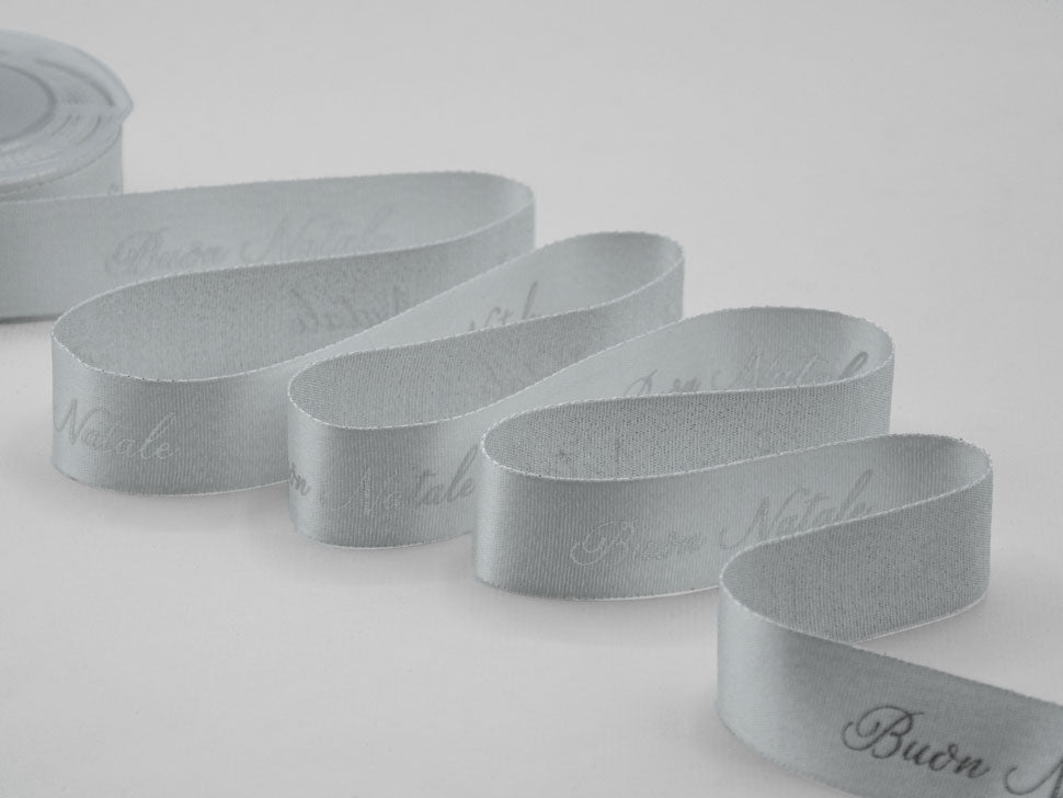 Raso Boutique Lame 25 MM Ser. Laminata Buon Natale Argento. Questa magnifica variante del nostro doppio raso è caratterizzata dalla tramatura con filato lamè che da un lato dona un aspetto glitter al nastro, dall'altro un aspetto più elegante e raffinato con la presenza del lamè delicata e tenue. Il Raso lamé è adatto a tutte le confezioni per il Natale, alle nozze, alle celebrazioni eleganti e glamour. Qui viene presentata la versione stampata in serigrafia laminata. Codice colore# 20W101 - CONFEZIONATO IN BOBINA DA METRI 10