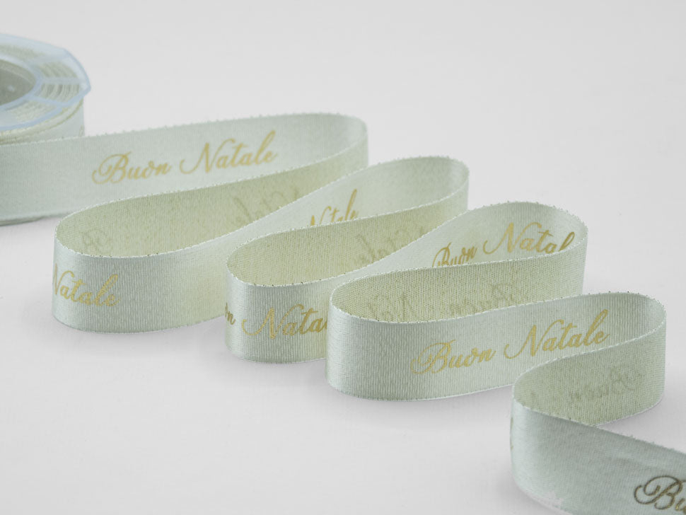 Raso Boutique Lame 25 MM Ser. Laminata Buon Natale Oro. Questa magnifica variante del nostro doppio raso è caratterizzata dalla tramatura con filato lamè che da un lato dona un aspetto glitter al nastro, dall'altro un aspetto più elegante e raffinato con la presenza del lamè delicata e tenue. Il Raso lamé è adatto a tutte le confezioni per il Natale, alle nozze, alle celebrazioni eleganti e glamour. Qui viene presentata la versione stampata in serigrafia laminata. Codice colore# 20W102 - CONFEZIONATO IN BOBINA DA METRI 10