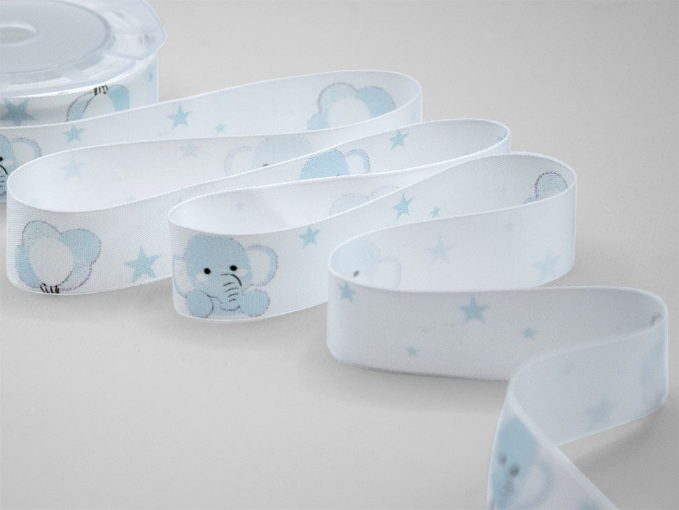 Raso Camelia 25 MM Collezione Elefantini Azzurro. Nastro in raso semplice, lucido e setoso, perfetto per la stampa viene presentato in molte fantasie. Codice colore# 19S2/593 - CONFEZIONATO IN BOBINA DA METRI 15