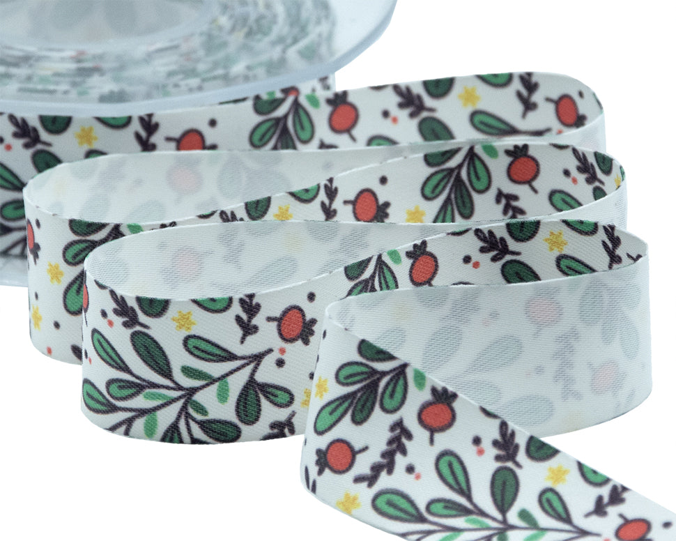 Raso Seta 25 mm Stampa Natale Vischio. Il raso seta è un nastro molto delicato, adatto ad ogni tipo di confezionamento. Grazie alla sua leggerezza e setosità, può essere utilizzato nella creazione di bomboniere e decorazioni per cerimonie ed eventi eleganti. Le cimosse lisce e la sua texture opaca donano estrema morbidezza al nastro, rendendolo facile da lavorare e adatto alla realizzazione di fiocchi e rifiniture. Qui è presentato in una variante con stampa digitale. Codice colore #24F1086 - CONFEZIONATO IN BOBINA DA METRI 15