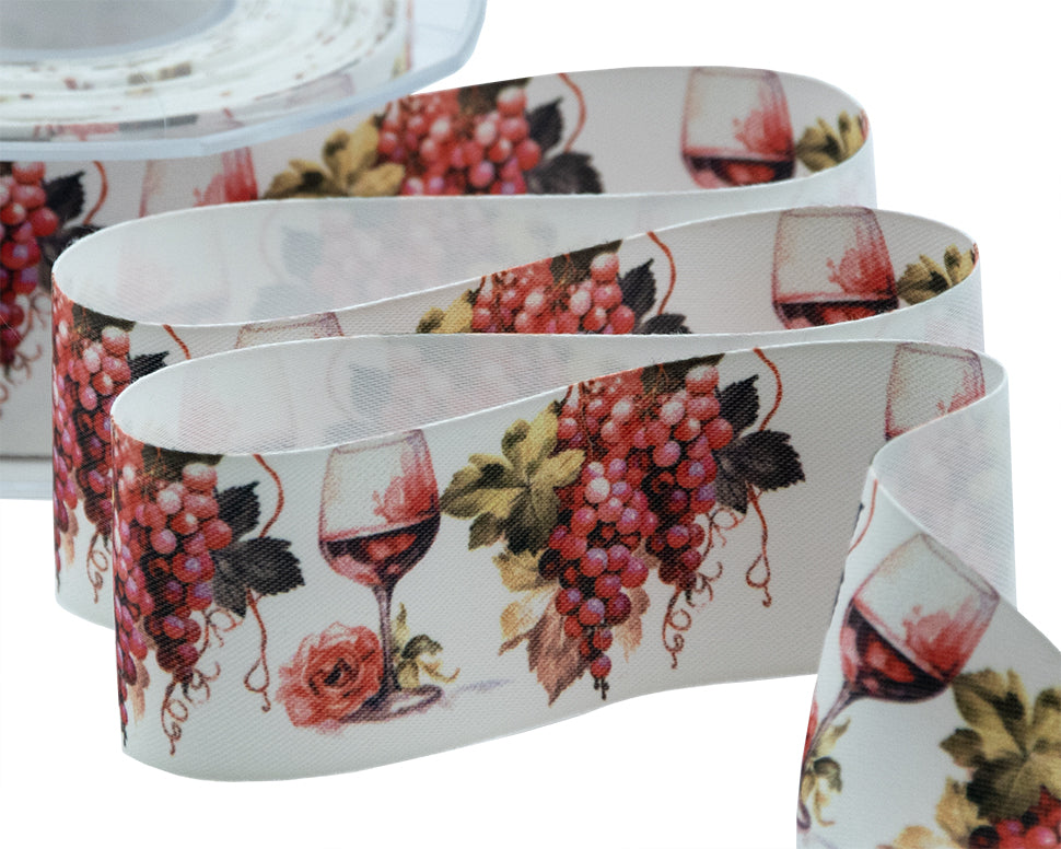 Raso Seta 40 mm Stampa Vino Rosso. Il raso seta è un nastro molto delicato, adatto ad ogni tipo di confezionamento. Grazie alla sua leggerezza e setosità, può essere utilizzato nella creazione di bomboniere e decorazioni per cerimonie ed eventi eleganti. Le cimosse lisce e la sua texture opaca donano estrema morbidezza al nastro, rendendolo facile da lavorare e adatto alla realizzazione di fiocchi e rifiniture. Qui è presentato in una variante con stampa digitale. Codice colore #24L46 - CONFEZIONATO IN BOBINA DA METRI 15