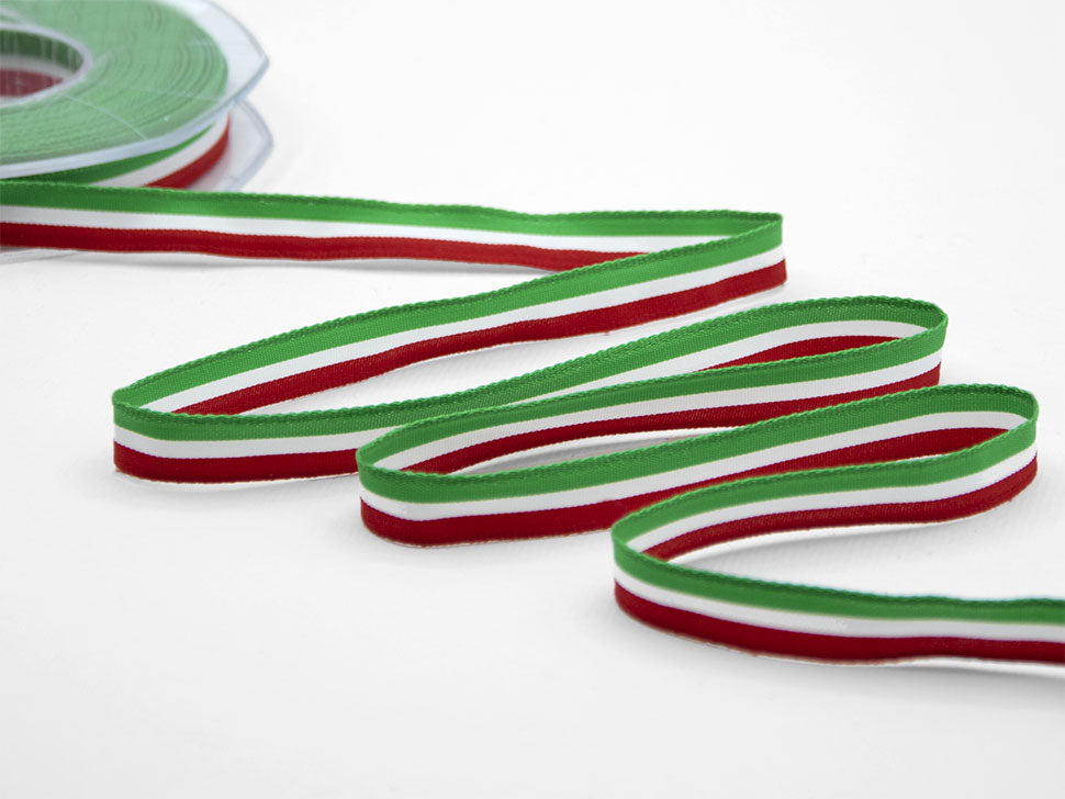 Raso Tricolore 10 MM Verde Bandiera. Nastro tricolore rosso, bianco e verde. Codice colore# 32 - CONFEZIONATO IN BOBINA DA METRI 25