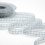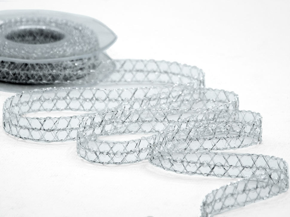 Rete Sirio Lame 15 MM Argento. Nastro tessuto a rete con filato lurex e lamé per la decorazione natalizia. Codice colore# 101 - CONFEZIONATO IN BOBINA DA METRI 15