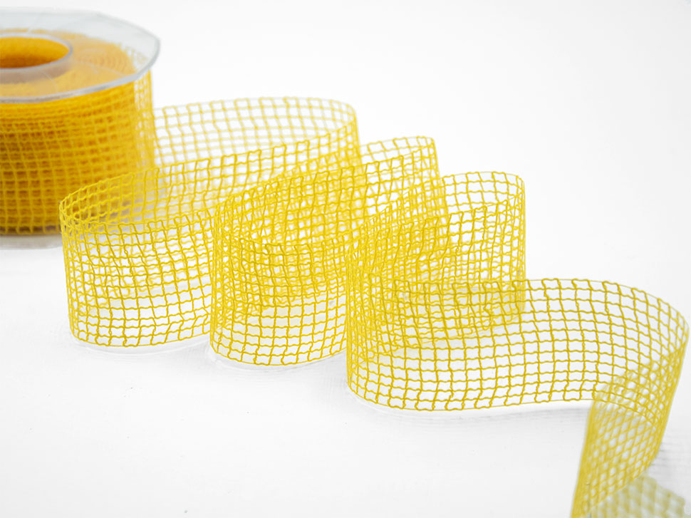 Retina 50 MM Giallo. Rete per confezioni e decorazioni tessuta con un filato cotoniero, opaco, dall'aspetto molto naturale, anche detta rete Africa. Codice colore# 428 - CONFEZIONATO IN BOBINA DA METRI 15