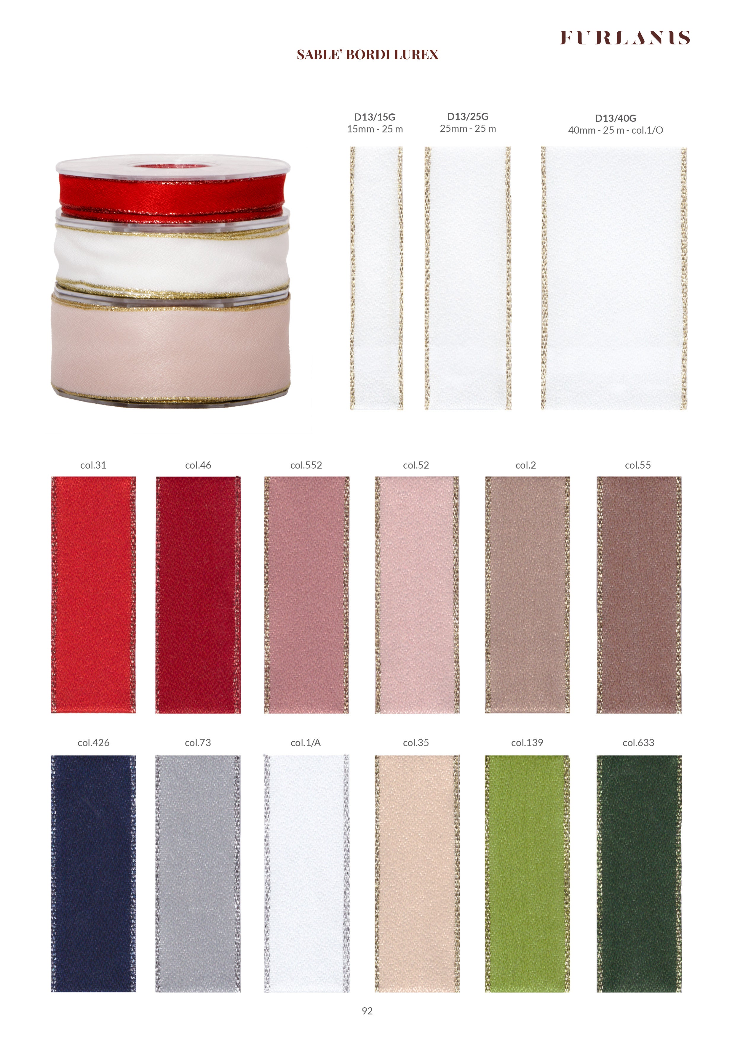 Sable Bordi Lurex Con Rame 25 MM Bianco Naturale Oro. Per creare la giusta atmosfera natalizia è indispensabile prestare attenzione ad ogni dettaglio come scegliere il nastro giusto come l’articolo D13 in tutte le sue versioni. L’articolo Sablé bordi Lurex è pensato per il Natale, sia per l’arredamento, perché immerge la tua casa immediatamente in quella tipica atmosfera natalizia, sia per le creazioni come ghirlande, fiocchi per l’albero di Natale, per le confezioni di pacchetto regalo. Il sablè ha una trama irregolare e sabbiata, è un nastro coprente, opaco, morbido e setoso. I bordi del nastro Sablè in lurex sono rinforzati quindi sono durevoli e flessibili, facili da modellare e mantengono la loro forma per i vari scopi di decorazione.. Codice colore# 1/O - CONFEZIONATO IN BOBINA DA METRI 25