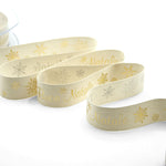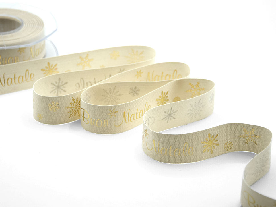 Tela Rustica Buon Natale 25 MM Oro. Questo tessuto tipo cotone ha un aspetto molto naturale e rustico. Qui è presentata un aversione con una bella stampa serigrafica. Codice colore# 102 - CONFEZIONATO IN BOBINA DA METRI 15