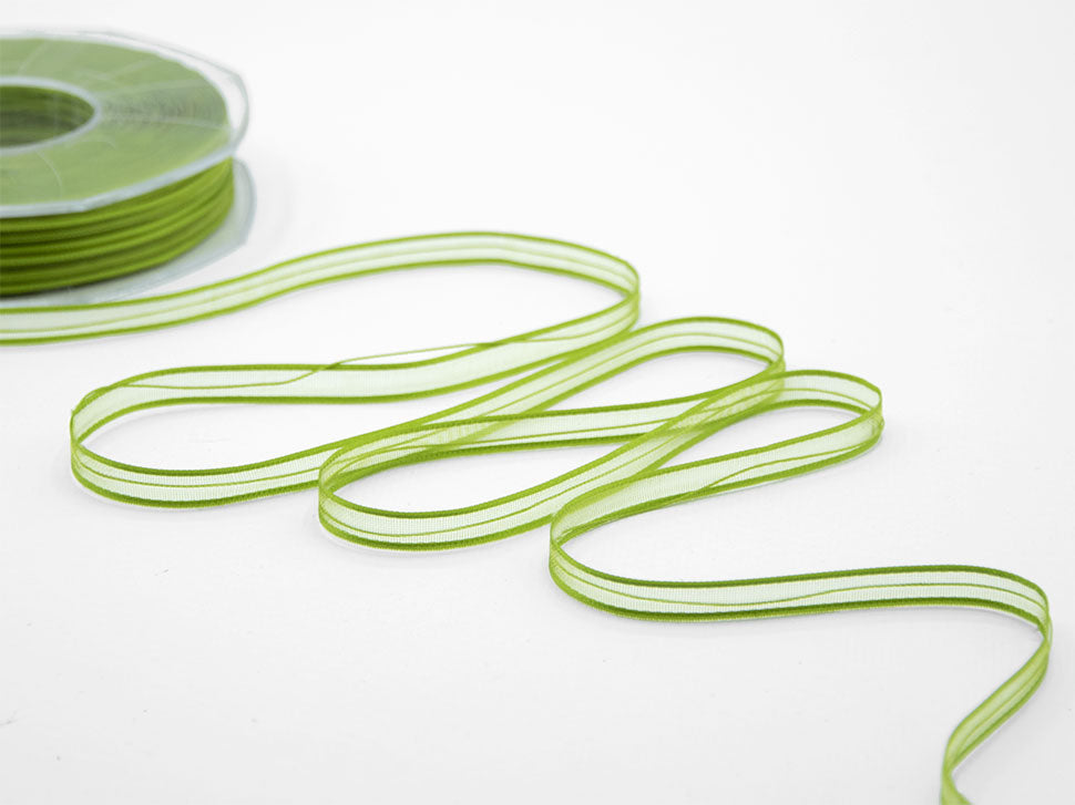 Velo Bordi Raso Tir. Centr. 6 MM Verde Pistacchio. Nastro organza per fiocchetti automatici con filo da tirare al centro. Codice colore# 139 - CONFEZIONATO IN BOBINA DA METRI 50