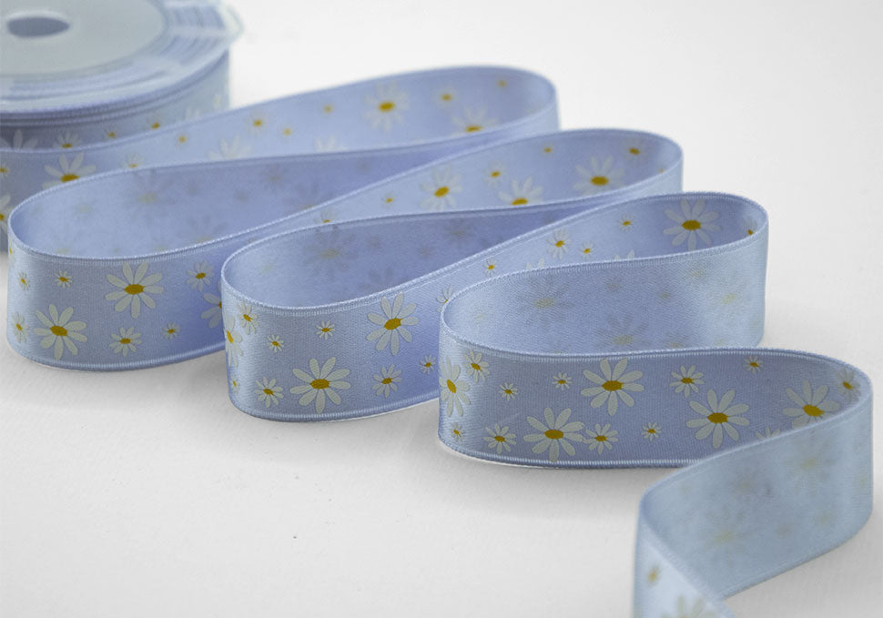 Doppio Raso Stampa Serigraf.25 mm Margherite Bicolor Ceruleo
