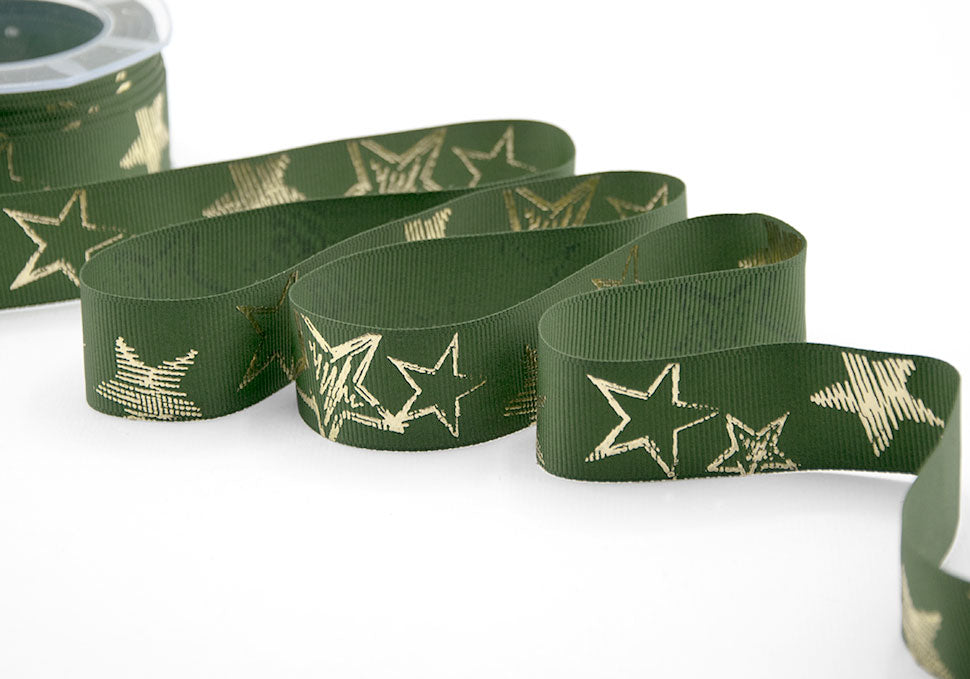 Gros Grain 30 mm Verde inglese Stampa Stelle Oro