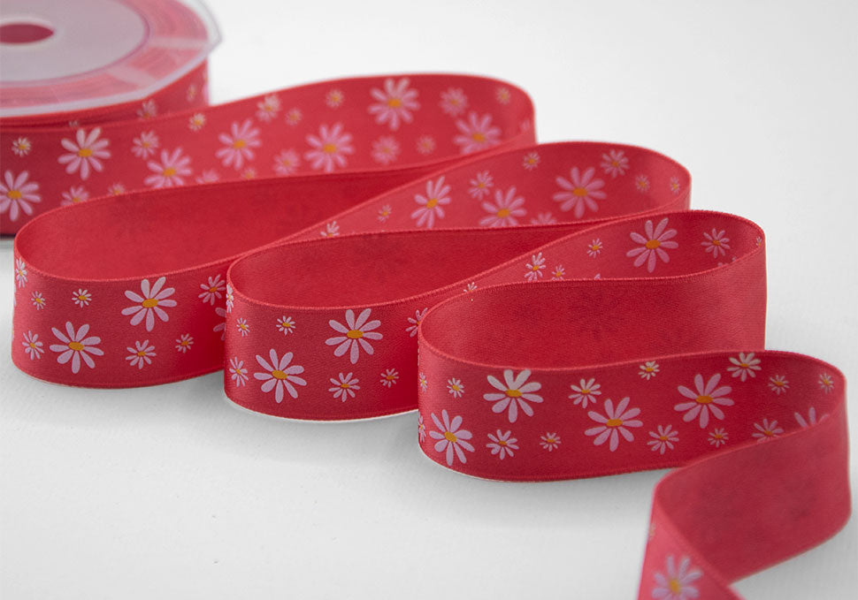 Doppio Raso Stampa Serigraf.25 mm Margherite Bicolor Corallo