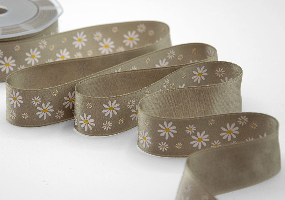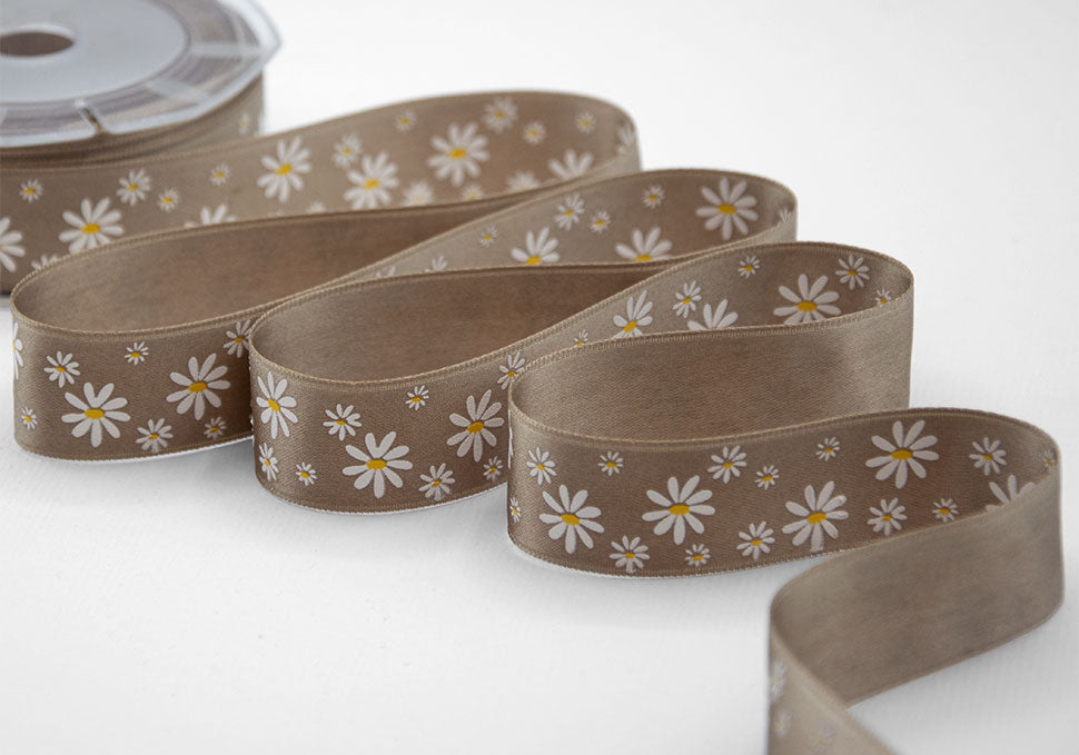 Doppio Raso Stampa Serigraf.25 mm Margherite Bicolor tortora