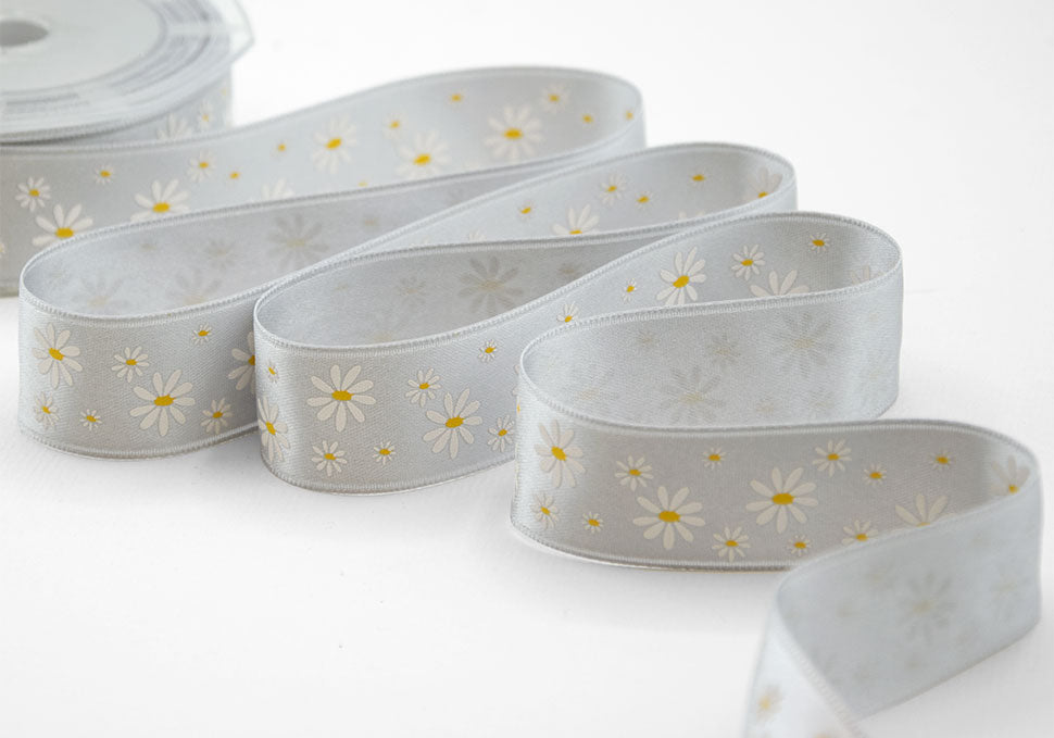 Doppio Raso Stampa Serigraf.25 mm Margherite Bicolor Grigio Perla