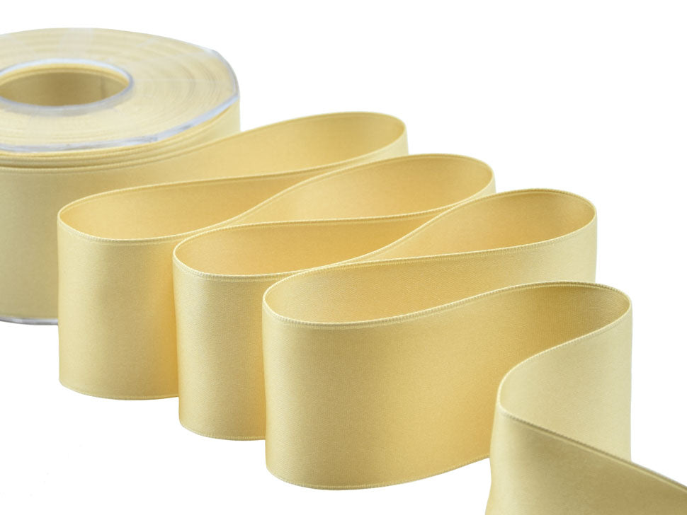 Il nastro elegante e raffinato per definizione è il doppio raso. È versatile e bello da lavorare e, nella sua semplicità, si presta ad ogni utilizzo. Essendo un prodotto di alta qualità si annoda molto facilmente formando un bel fiocco con le code che presentano un taglio netto e definito, che non si sfilaccia. Il suo aspetto è luminoso, consistente e corposo, ma al tatto è decisamente delicato e setoso. I suoi 50mm di altezza e le infinite possibilità di personalizzazione lo rendono un nastro ideale per molteplici utilizzi: dalla confezione di bomboniere di matrimoni e cerimonie alla decorazione dei fiori e della tavola; dalle confezioni regalo, anche natalizie, a tutti gli eventi di pregio. La bobina contiene 25 metri di nastro doppio raso 50mm. Disponibile in un’ampia gamma di tonalità e altezze, viene qui presentato nel colore 177, giallo oro