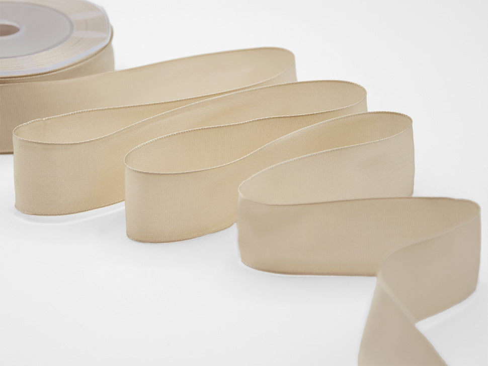 Carlotta Raso Bordi Rame 27 MM Beige. Il taffetà con i bordi animati, Carlotta, è setoso e lucido. Il suo tessuto è formato da fili sottilissimi che donano un aspetto particolarmente ricercato e il bordo in rame permette di fare confezioni perfette, ben modellate, particolarmente adatte per la pasticceria, la dolciaria, il cake-design e tutta la vetrinistica. Codice colore# 2 - CONFEZIONATO IN BOBINA DA METRI 20