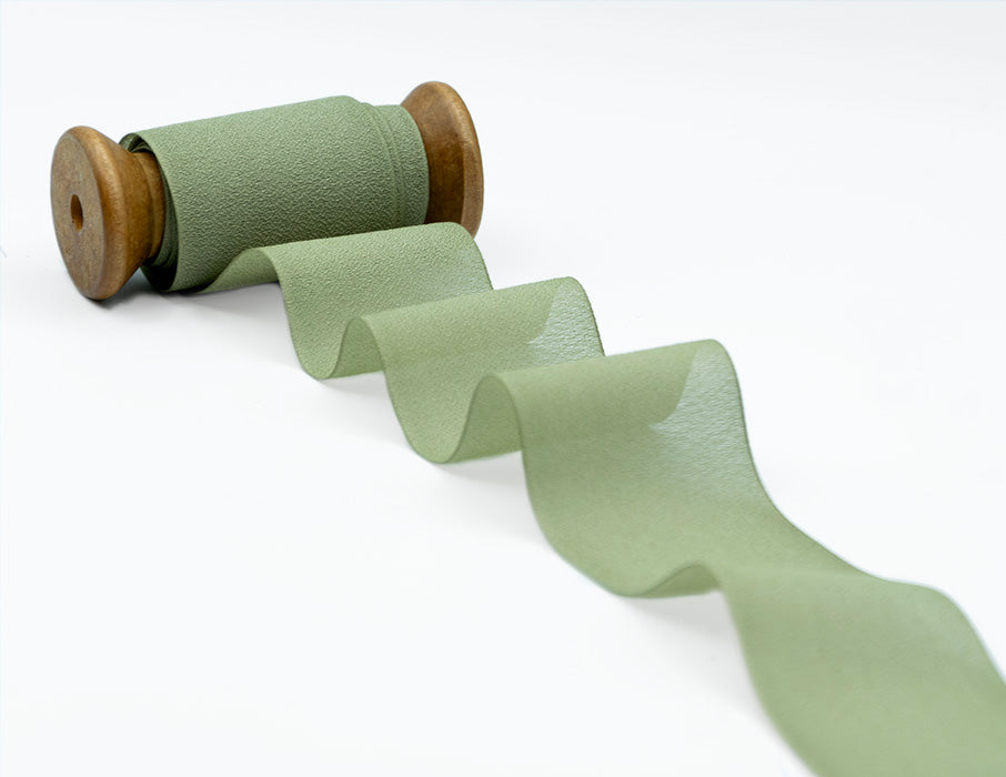 Crêpe Effetto Seta 48 mm Verde Salvia. Il nastro in chiffon ha un aspetto molto delicato e leggero, morbido al tatto come un nastro in seta. Di alta qualità perché prodotto in filato 100% poliestere, è caratterizzato da una texture opaca e semi trasparente. Abbinalo ai tuoi bouquet floreali, ai tuoi inviti in carta, per creare un originale segnaposto o per un packaging ultra raffinato. Codice colore # 15. Confezionato in bobina da 25 metri.