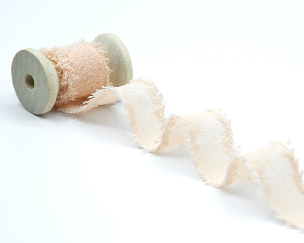 Crêpe Effetto Seta Sfrangiato Albicocca Chiaro 25mm. Il nastro in chiffon ha un aspetto molto delicato e leggero, morbido al tatto come un nastro in seta. Di alta qualità perché prodotto in filato 100% poliestere, è caratterizzato da una texture opaca e semi trasparente e da bordi sfilacciati. Abbinalo ai tuoi bouquet floreali, ai tuoi inviti in carta, per creare un originale segnaposto o per un packaging ultra raffinato. Codice colore #121 - CONFEZIONATO IN BOBINA DA METRI 25