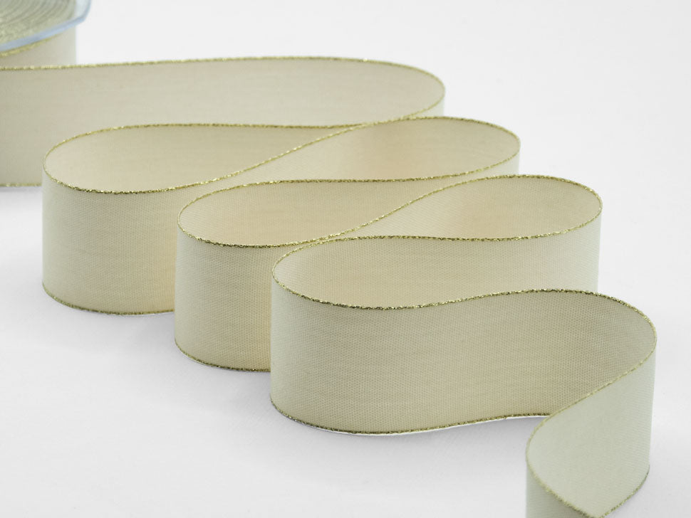 Policotone Bordi Oro 40 MM Avorio. I nastri in policotone e dall’aspetto naturale sono in linea con le tendenze green per realizzare confezioni e decorazioni dall’effetto rustico o grezzo. Opaco, dall’aspetto naturale, risulta ancora più elegante grazie alla presenza dei bordi oro. Si lavora facilmente e viene usato sempre più spesso per le creazioni di confezioni di regalo di lusso, per le maniglie di shopper, per le creazioni di bomboniere, per le decorazioni natalizie, per gli addobbi floreali e per le confezioni alimentari. Apprezzato anche da importanti marchi di moda è stato scelto per la personalizzazione del loro nastro con logo. Come tutti i nostri nastri si annoda molto facilmente e al taglio non si sfilaccia. Il nastro in tessuto tipo cotone viene prodotta in un’ampia gamma di colori ed altezze.. Codice colore# 35 - CONFEZIONATO IN BOBINA DA METRI 20