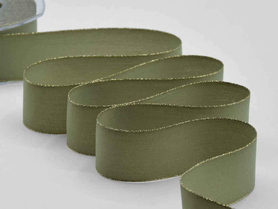 Policotone Bordi Oro 40 MM Salvia. I nastri in policotone e dall’aspetto naturale sono in linea con le tendenze green per realizzare confezioni e decorazioni dall’effetto rustico o grezzo. Opaco, dall’aspetto naturale, risulta ancora più elegante grazie alla presenza dei bordi oro. Si lavora facilmente e viene usato sempre più spesso per le creazioni di confezioni di regalo di lusso, per le maniglie di shopper, per le creazioni di bomboniere, per le decorazioni natalizie, per gli addobbi floreali e per le confezioni alimentari. Apprezzato anche da importanti marchi di moda è stato scelto per la personalizzazione del loro nastro con logo. Come tutti i nostri nastri si annoda molto facilmente e al taglio non si sfilaccia. Il nastro in tessuto tipo cotone viene prodotta in un’ampia gamma di colori ed altezze.. Codice colore# 15 - CONFEZIONATO IN BOBINA DA METRI 20