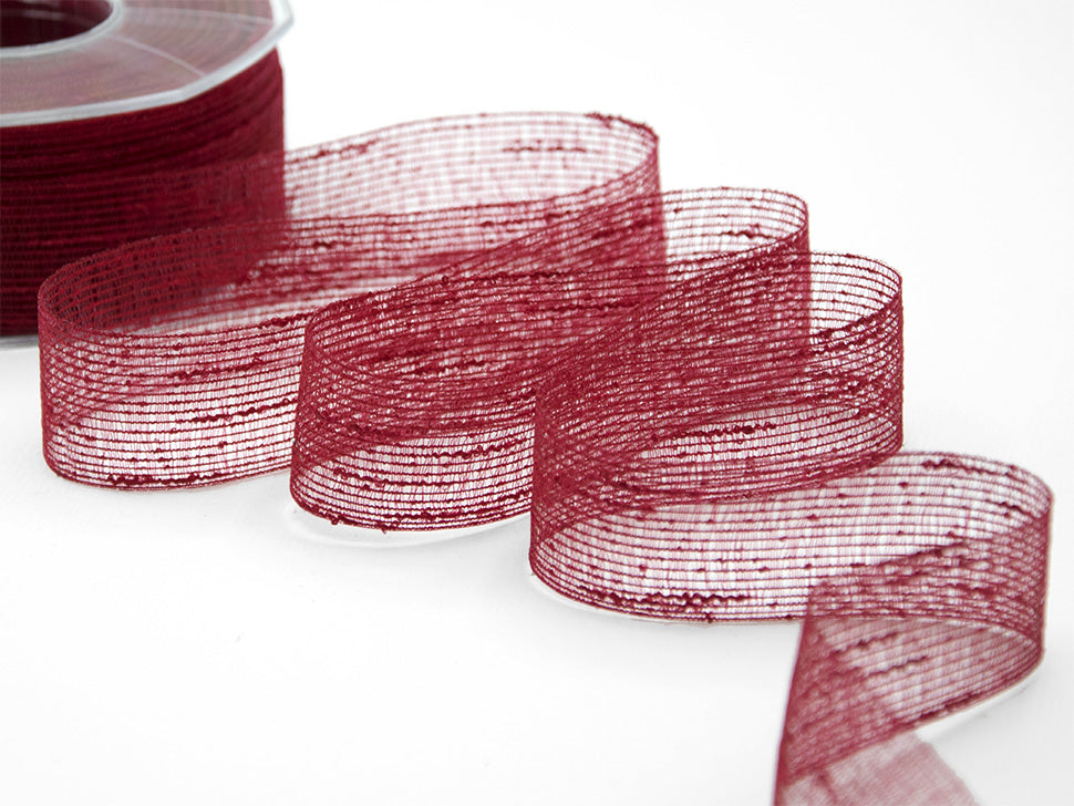 Veletta 28 MM Amaranto. Il nastro veletta è un nastro rustico e trasparente, tessuto con filato bouclè che pur coprendo e nascondendo, lascia intravedere ciò che sta sotto. L’articolo N27 è composto da fili irregolari con riccioli che sporgono con effetto asola. Il nastro veletta assume così un aspetto irregolare, semplice, grezzo ed è caratterizzato da piccoli nodi di grandezza variabile in superficie. Questo nastro rustico è adatto per creazioni fai da te originali, sia in stile casual che in stile contemporaneo, come decorare e abbellire la casa o il giardino oppure alle creazioni di splendide bomboniere home made adatte ad ogni cerimonia e ricorrenza. Codice colore# 46 - CONFEZIONATO IN BOBINA DA METRI 25