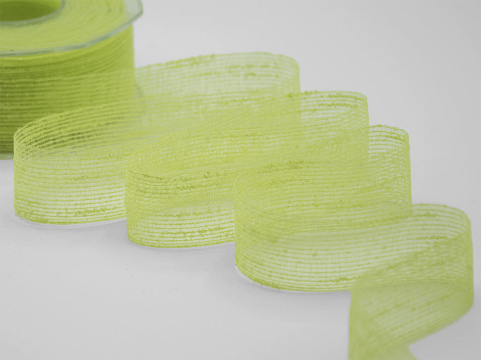 Veletta 40 MM Verde Acido. Il nastro veletta è un nastro rustico e trasparente, tessuto con filato bouclè che pur coprendo e nascondendo, lascia intravedere ciò che sta sotto.