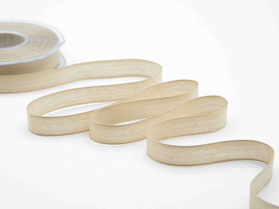 Velo Cotone Resinato 15 MM Beige. Tessuto opaco e trasparente come un cotone leggero, con i bordi animati da un filo metallico per dare più sostegno ai vostri fiocchi. Codice colore# 2 - CONFEZIONATO IN BOBINA DA METRI 25