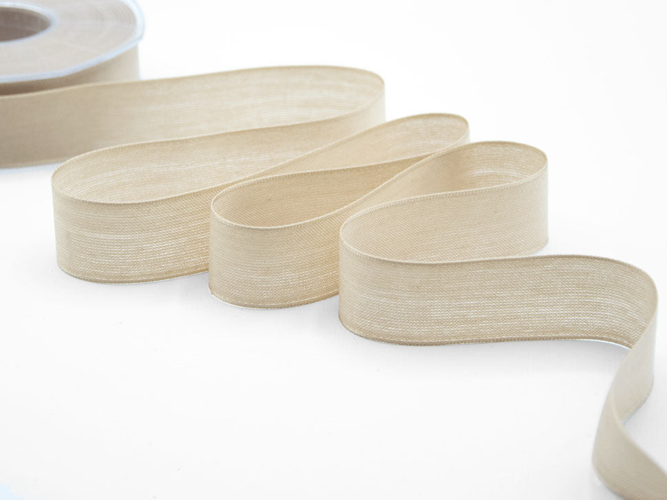 Velo Cotone Resinato 25 MM Beige. Tessuto opaco e trasparente come un cotone leggero, con i bordi animati da un filo metallico per dare più sostegno ai vostri fiocchi. Codice colore# 2 - CONFEZIONATO IN BOBINA DA METRI 25