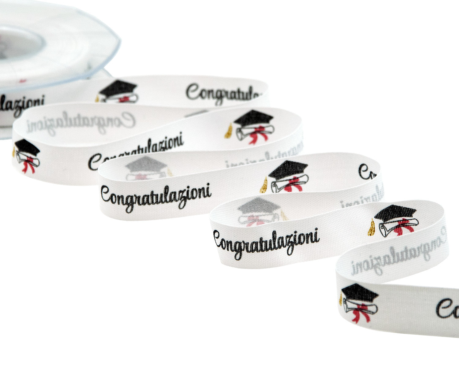 Policotone 15 mm Stampa Laurea. I nastri in policotone e dall’aspetto naturale sono in linea con le tendenze green per realizzare confezioni e decorazioni dall’effetto rustico o grezzo. Molto apprezzato per le sue caratteristiche sono i nastri in poliestere cotoniero. Opaco, dall’aspetto naturale, è piacevole al tatto perché è morbido e caldo, sembra leggermente felpato. Si lavora facilmente e viene usato sempre più spesso per le creazioni di confezioni di regalo di lusso, per le maniglie di shopper, per le creazioni di bomboniere, per le decorazioni natalizie, per gli addobbi floreali e per le confezioni alimentari. Apprezzato anche da importanti marchi di moda è stato scelto per la personalizzazione del loro nastro con logo. Come tutti i nostri nastri si annoda molto facilmente e al taglio non si sfilaccia. Il nastro in tessuto tipo cotone viene prodotto in un’ampia gamma di colori ed altezze, qui è presentato in una variante con stampa digitale. Codice colore #24/31 - CONFEZIONATO IN BOBINA DA METRI 15