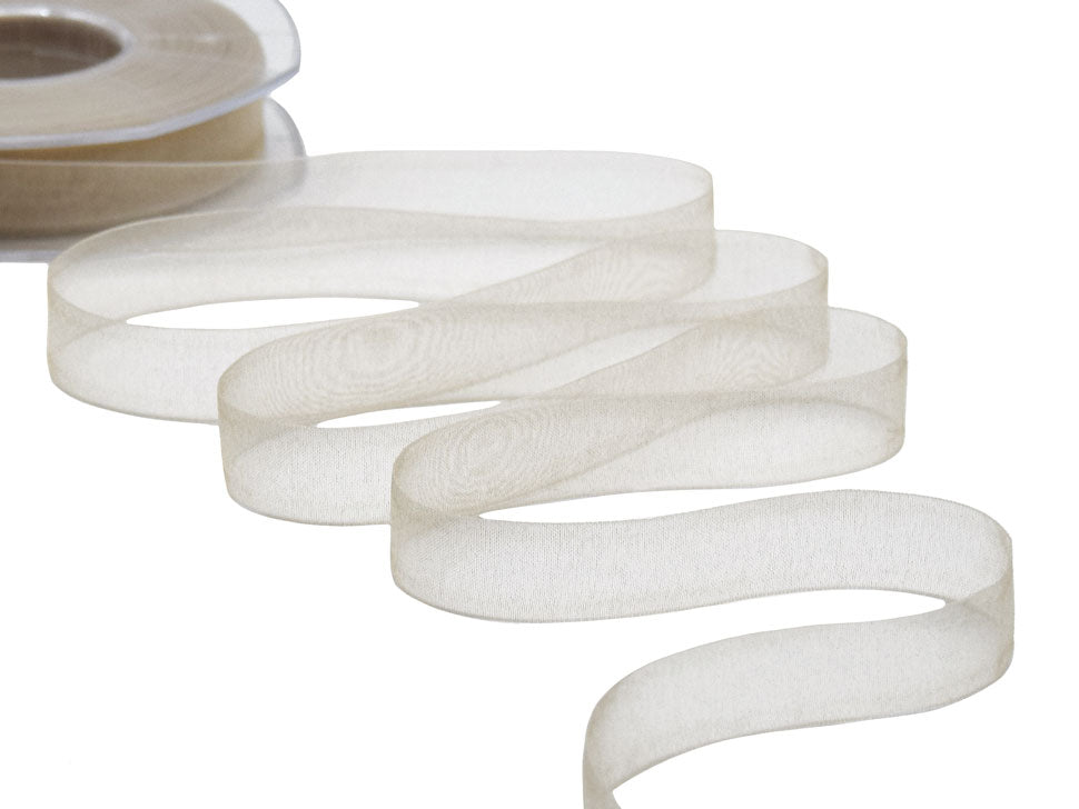 Organza 15mm Beige. Nastro in velo di organza, trasparente, perfetto per le nozze e la decorazione del matrimonio e nei pacchetti regalo. È tessuto con un filato di organza lucido. Codice colore #2 - CONFEZIONATO IN BOBINA DA METRI 50