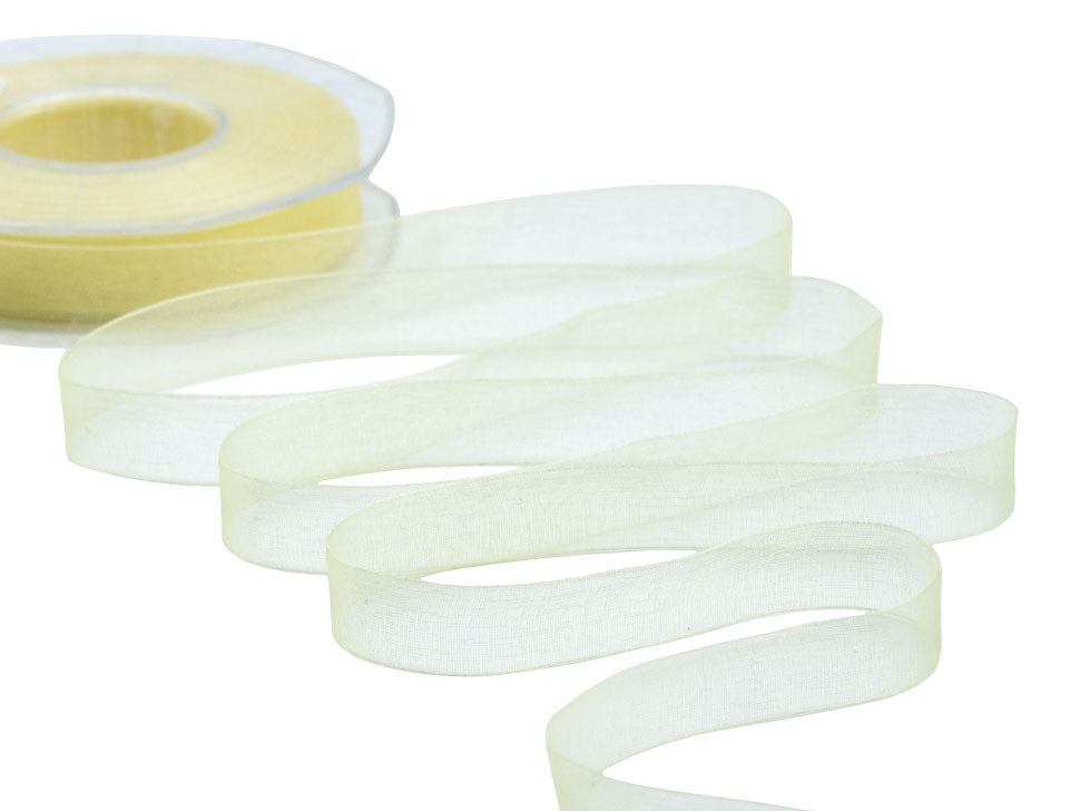 Organza 15mm Giallo. Nastro in velo di organza, trasparente, perfetto per le nozze e la decorazione del matrimonio e nei pacchetti regalo. È tessuto con un filato di organza lucido. Codice colore #428 - CONFEZIONATO IN BOBINA DA METRI 50