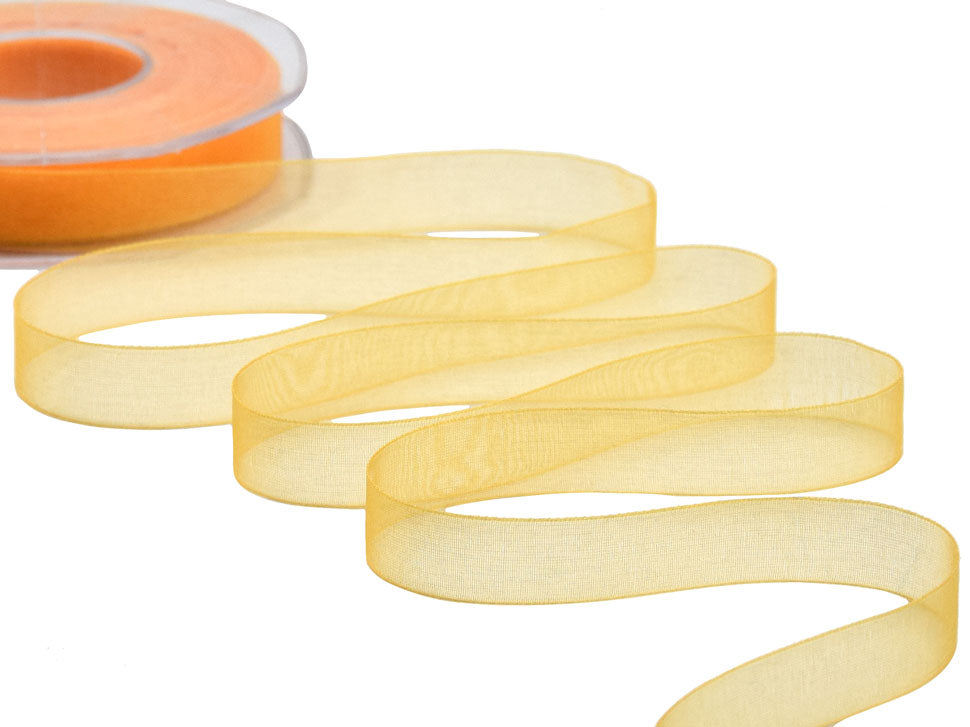 Organza 15mm Giallo Sole. Nastro in velo di organza, trasparente, perfetto per le nozze e la decorazione del matrimonio e nei pacchetti regalo. È tessuto con un filato di organza lucido. Codice colore #1006 - CONFEZIONATO IN BOBINA DA METRI 50