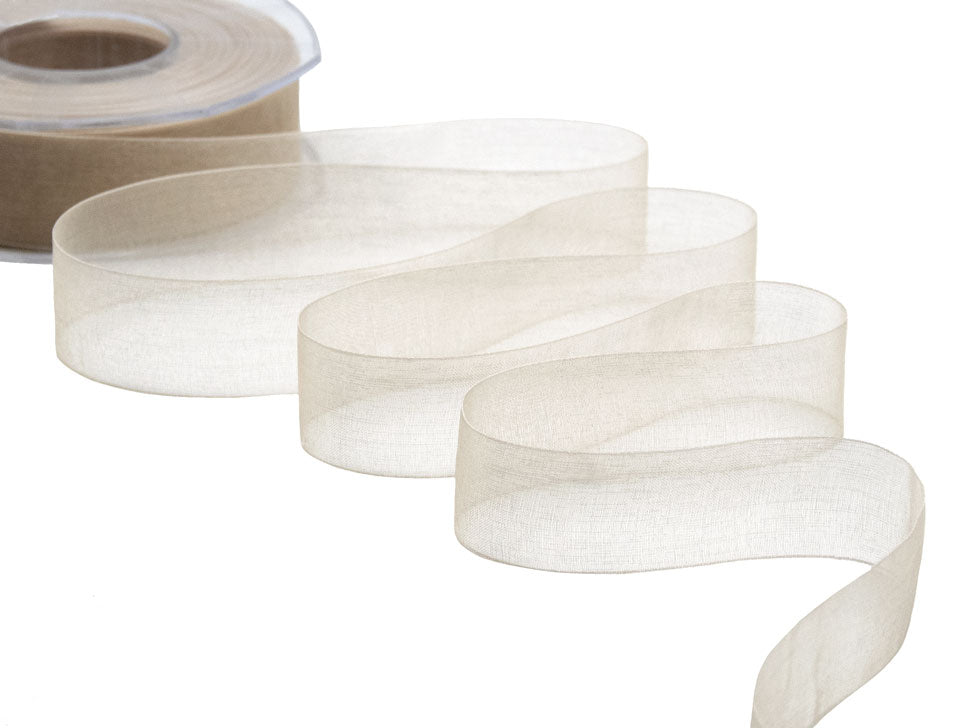Organza 25mm Beige. Nastro in velo di organza, trasparente, perfetto per le nozze e la decorazione del matrimonio e nei pacchetti regalo. È tessuto con un filato di organza lucido. Codice colore #2 - CONFEZIONATO IN BOBINA DA METRI 50