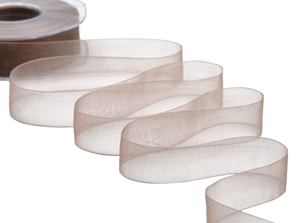 Organza 25mm Cannella. Nastro in velo di organza, trasparente, perfetto per le nozze e la decorazione del matrimonio e nei pacchetti regalo. È tessuto con un filato di organza lucido. Codice colore #55 - CONFEZIONATO IN BOBINA DA METRI 50