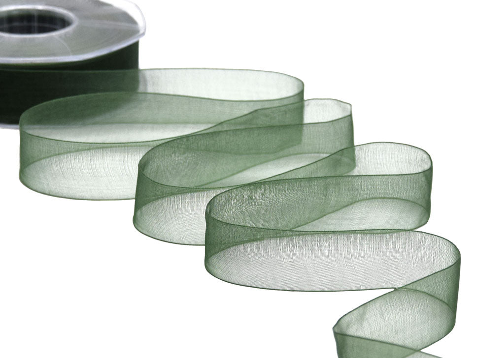 Organza 25mm Verde Inglese. Nastro in velo di organza, trasparente, perfetto per le nozze e la decorazione del matrimonio e nei pacchetti regalo. È tessuto con un filato di organza lucido. Codice colore #633 - CONFEZIONATO IN BOBINA DA METRI 50