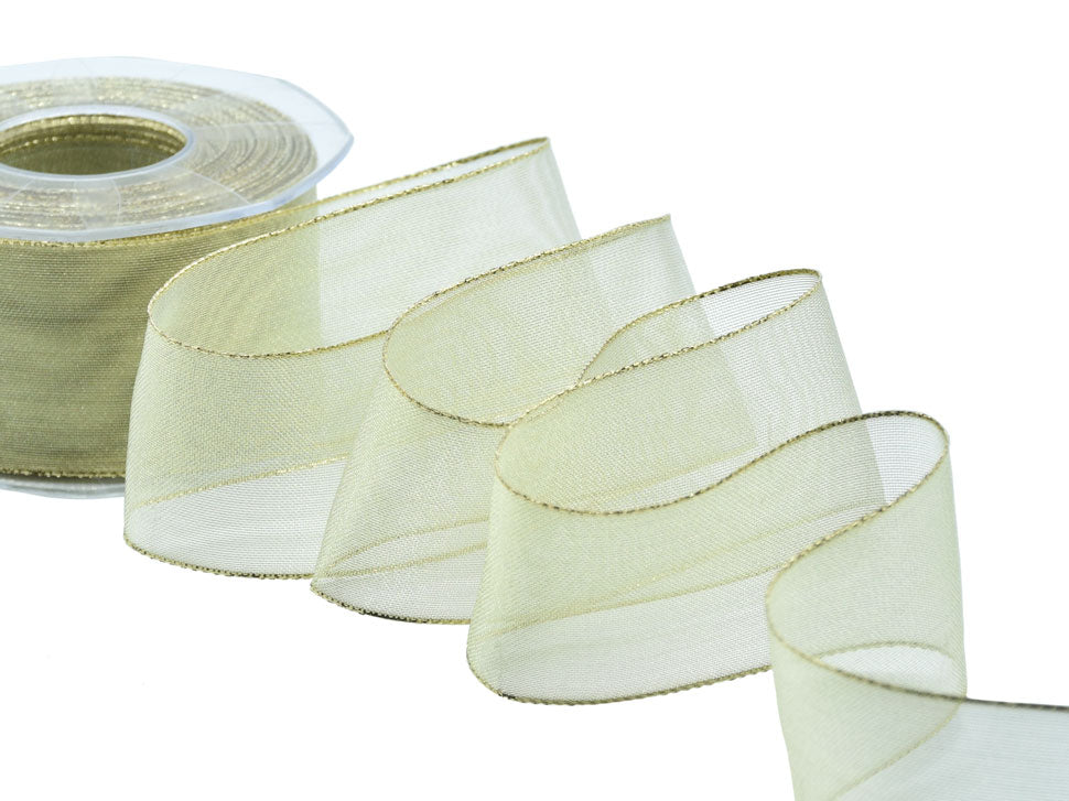 Velo Lame Animato 40 MM Oro. Il nastro di velo lamé è un tessuto dalla trama sottile e trasparente, molto brillante e scintillante. Dal design elegante, il rotolo di nastro lamé può essere utilizzato per una varietà di scopi. Bello da lavorare, possiamo creare bellissimi fiocchi per le confezioni eleganti e costose, creare decorazioni natalizie per la casa e per il giardino, personalizzare le bomboniere. Il nastro decorativo lamé è realizzato con filato 100% poliestere, con un bordo semplicemente più spesso contiene una texture leggera, lucida e morbida, offre un look lussuoso e una sensazione eterea.. Codice colore# 102 - CONFEZIONATO IN BOBINA DA METRI 25