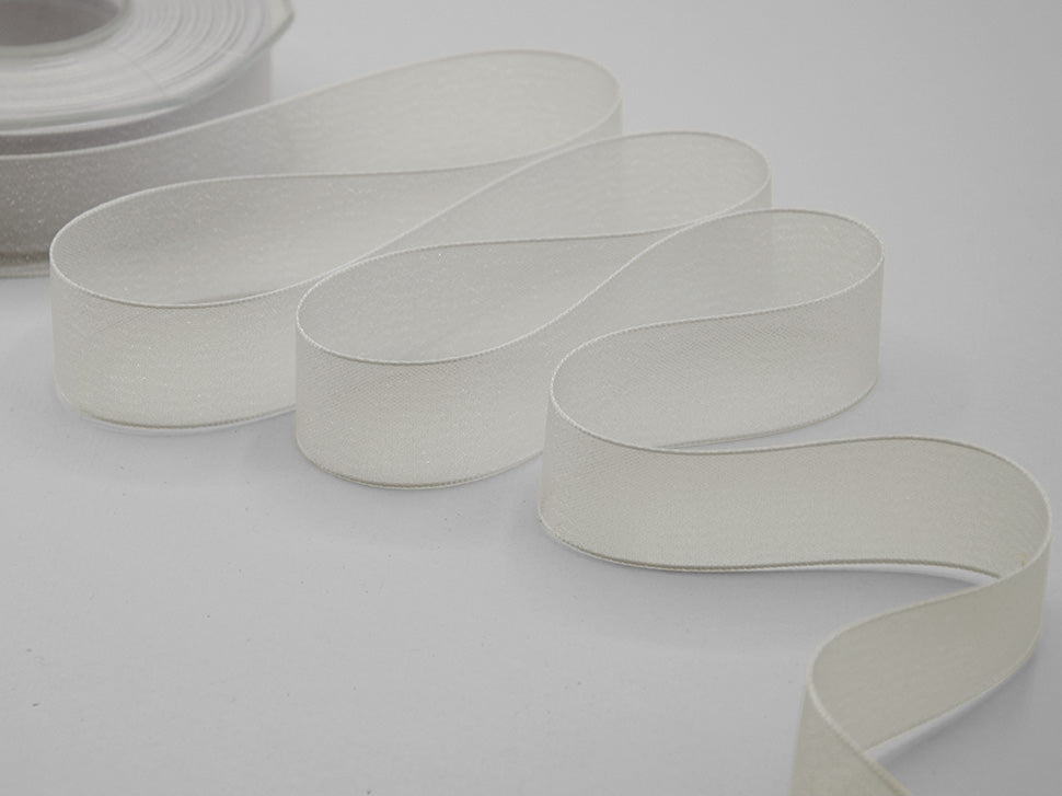 Velo Luminoso 40 MM Bianco Naturale. Il velo luminoso è un nastro dall’aspetto cangiante, iridato, luminoso, perché è tessuto con filato iridescente.