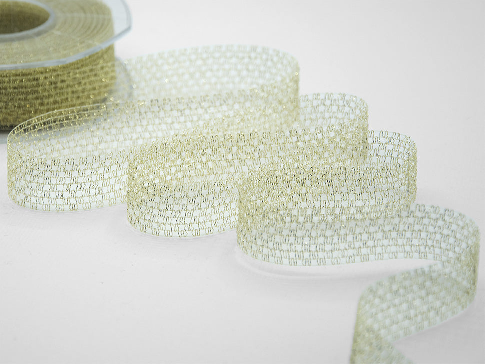 Antares Lurex 28 MM Oro. Rete sottile, con tramatura fitta ad effetto vedo non vedo, adatta per fiocchi e confezioni natalizie, si abbina con tutte le carte per pacchi regalo. L’articolo R300 è un nastro di rete di colore metallico.